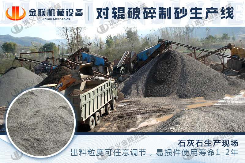 時產(chǎn)100噸對輥破碎機生產(chǎn)現(xiàn)場-石灰石破碎制砂